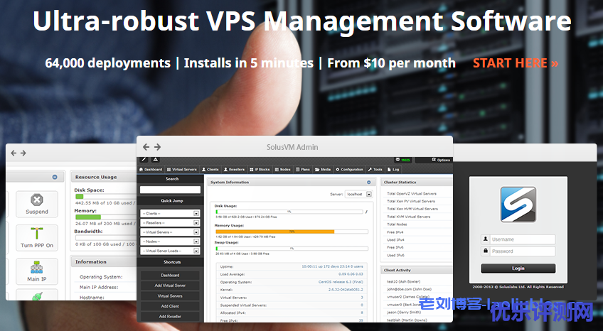 SolusVM较为流行,它是许多VPS提供商使用的虚拟化管理解决方案,也是市场上VPS用户最熟悉的控制面板之一。Solus Virtual Manager(SolusVM)是基于GUI的功能强大的VPS管理系统,具有完整的OpenVZ,Linux KVM,Xen半虚拟化和Xen HVM支持。SolusVM可以使你和你的客户轻松安全地管理VPS群集。