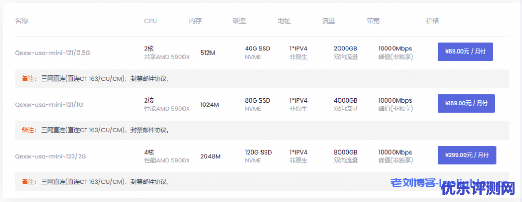 企鹅小屋美国一期VPS方案目前有3款配置,线路都一样,电信、移动和联通三网直连,共享10Gbps端口,封禁邮件协议以及25端口,使用上面的优惠码可以获得3折优惠,月付20.7元起: