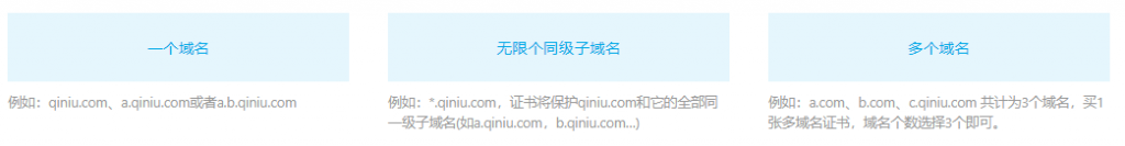 2.1.3,选择【多个域名】,例如:a.com、b.com、c.qiniu.com 共计为3个域名,买1张多域名证书,域名个数选择3个即可。推荐DigiCertEV Pro多域名SSL证书。
