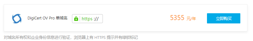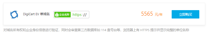 对域名所有权和企业身份信息进行验证,浏览器上有 HTTPS 提示并有绿锁标记