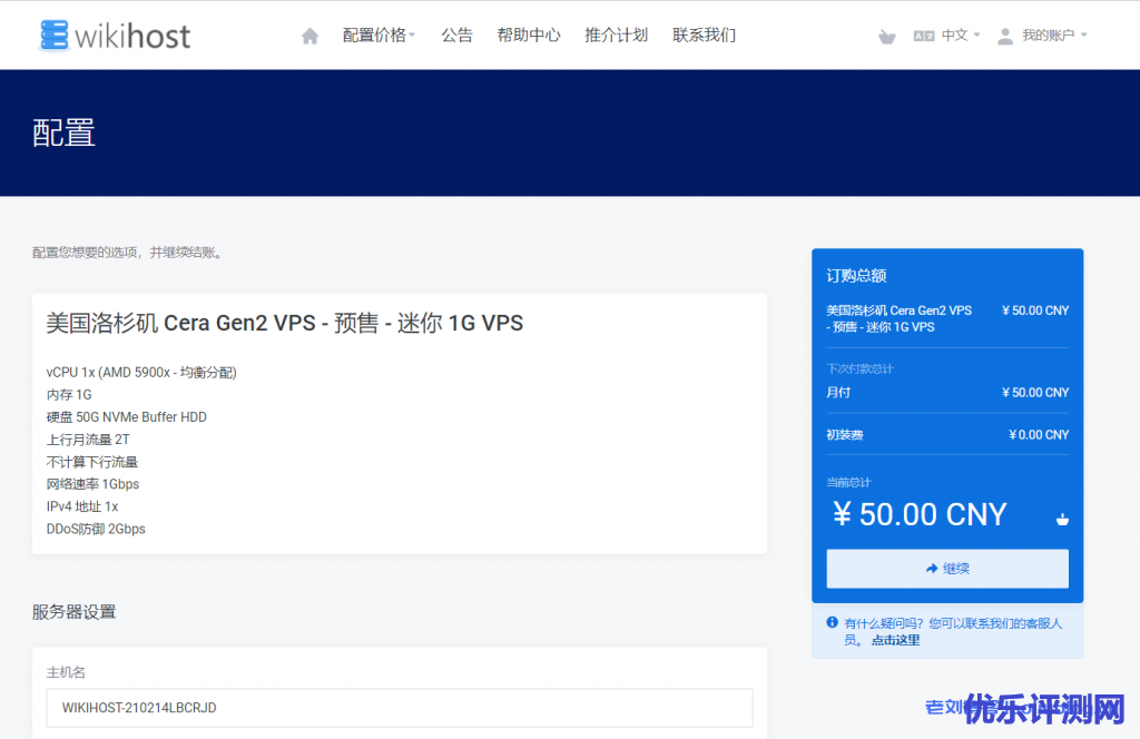 如前文《咸鱼云SaltyFishTech美国圣何塞三网联通回程优化线路直连VPS预售8折优惠$4.4/月起附优惠码及测试IP》中商家的预售活动,WikiHost微基主机服务近期也推出了比较热门的美国洛杉矶Cera机房虚拟服务器预售活动:美国洛杉矶 Cera Gen2 VPS – 预售 – 迷你 1G VPS。预售配置是1核1G内存,1Gbps带宽、月流量2TB(单向计算),预售价格只需50元/月,并且预售期间购买终身续费价格不变。且2021年2月14日23:59点前的预售订单额外赠送100G硬盘。