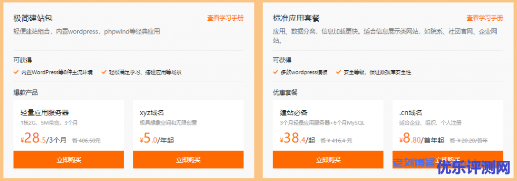 套餐包括极简建站包(轻便建站组合,内置wordpress,phpwind等经典应用)、标准应用套餐(应用、数据分离,信息加载更快。适合信息展示类网站,如院系、社团官网、企业网站。)、建站全家桶(顶级域名,海量存储。满足常规网络应用需求,适合有图片、视频等多媒体信息展示需求的网站应用)、标准应用套餐升级版(本套餐为标准应用套餐升级版,轻量服务器时长6个月!)和标准应用套餐VIP版(本套餐为标准应用套餐升级版,轻量服务器时长1年!)前往>>
