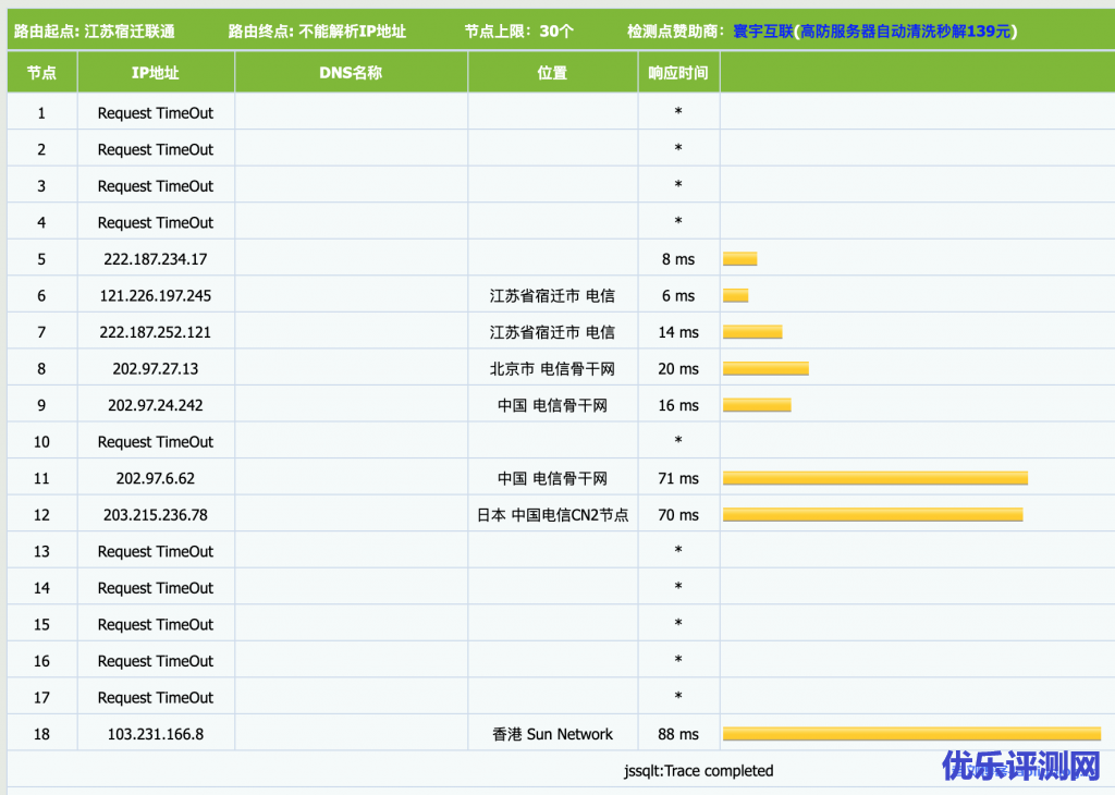 traceroute to 211.139.0.10 (211.139.0.10), 30 hops max, 60 byte packets 1 103.231.166.1 0.69 ms http: json http: json 2 * 3 63.140.7.57 0.95 ms http: json http: json 4 59.43.246.181 1.05 ms http: json http: json 5 59.43.248.249 4.75 ms http: json http: json 6 * 7 59.43.130.105 8.48 ms http: json http: json 8 * 9 * 10 * 11 221.183.54.49 40.22 ms http: json http: json 12 221.183.90.161 23.64 ms http: json http: json 13 211.139.0.10 26.83 ms http: json http: json ----------------------------------------------------------------------