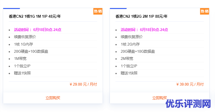 | 香港 | 1核 | 2G | 2M | 1个 | 88元/年 | 点击购买 |