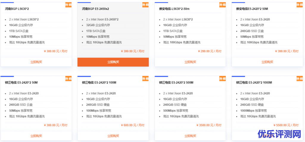 | 河南 | 2 x Intel Xeon L5630*2 | 16G | 1TB SATA | 10M | 300元/月 | 点击购买 |