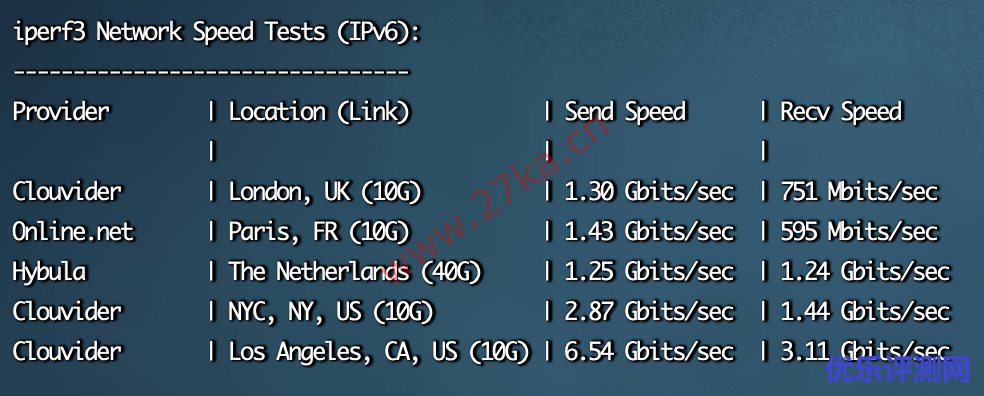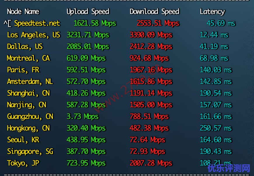 官方网站上面写的是默认是10Gbps带宽,我们直接用在中国大陆的三网的节点来做个带宽的上下行测试,看看可以跑到多少。数据如下,上行是587Mbps,下行是1505Mbps: