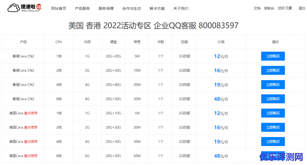 | 美国CERA | 1G | 1G | 10M | 30G | 12元/月 | 点击购买 |