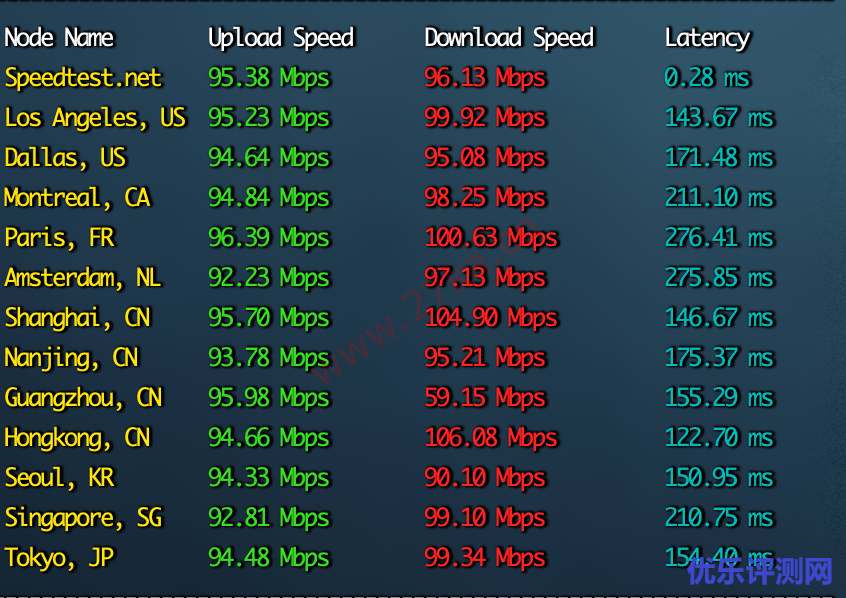 官方网站上面写的是默认是100Mbps带宽,我们直接用在中国大陆的三网的节点来做个带宽的上下行测试,看看可以跑到多少。数据如下,上行是100Mbps,下行是100Mbps: