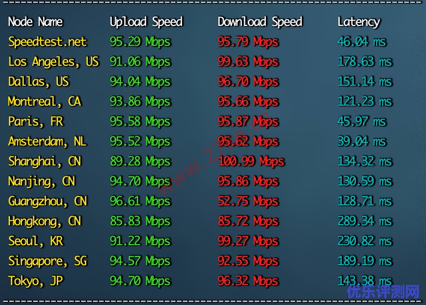 官方网站上面写的是默认是100Mbps带宽,我们直接用在中国大陆的三网的节点来做个带宽的上下行测试,看看可以跑到多少。数据如下,上行是100Mbps,下行是100Mbps: