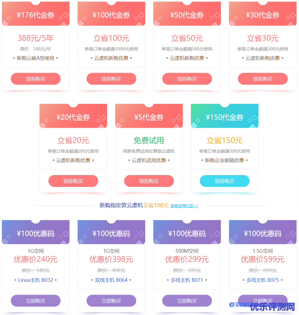 新用户专享优惠,获取之日起7天内有效活动规则。云峰A型1G云虚机,5年仅需388元,超值款立省100元。新购指定款云虚机立省100元。