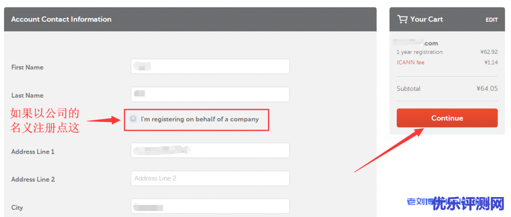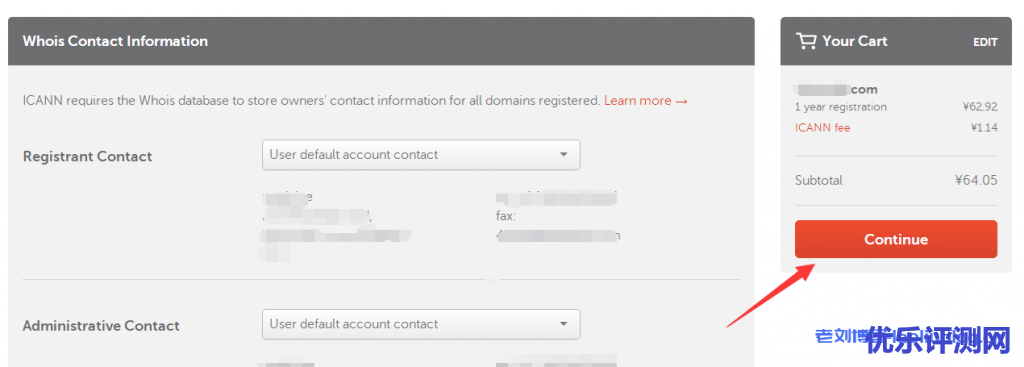 5,namecheap账号注册完,会提示填写你的个人信息,确认无误后点击Continue。