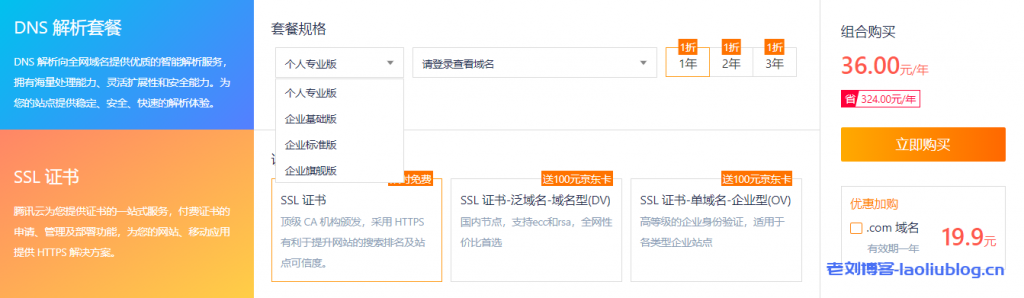 SSL证书36元/年,组合购买.com域名19.9元首年。