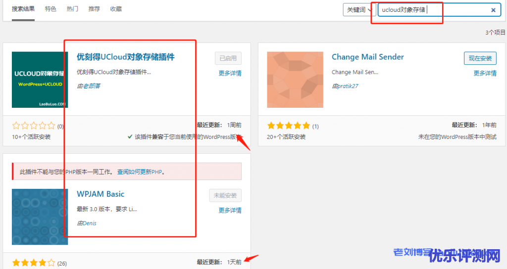 在wordpress后台搜索“ucloud对象存储”,如下出现的最近更新过的插件可以使用,配置方法插件安装后有相关教程。