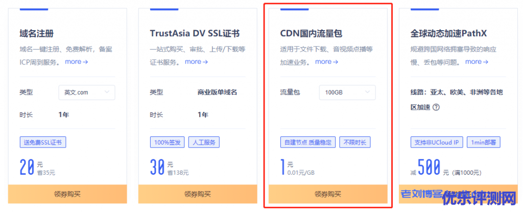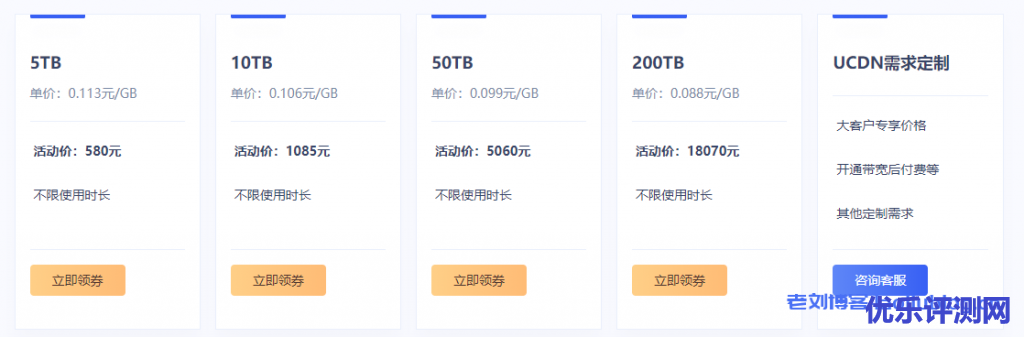 UCloud对象存储US3的免费额度是实名认证用户均可享受20GB免费云存储空间和20GB/月免费下载流量,一个普通站,免费额度足够用了;UCloud CDN流量包是目前市面上唯一一个不限使用有效期的,而且目前促销折扣力度大,续费同价,适合入手:可以先去全球大促页面https://www.ucloud.cn/site/active/kuaijie.html#products领一个1元100GB的CDN流量包试试水,觉得不错的话,然后再去CDN促销页面领其他规格的流量包。