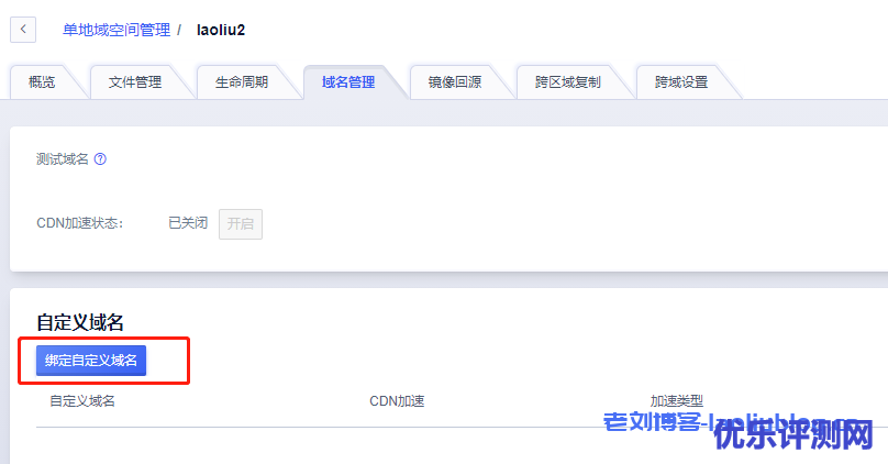 来到我们的对象存储,点击域名管理,绑定新的用户域名,这样我们就可以把储存‘桶’的域名改成我们自定义的域名,复制CNAME,一步步操作即可。