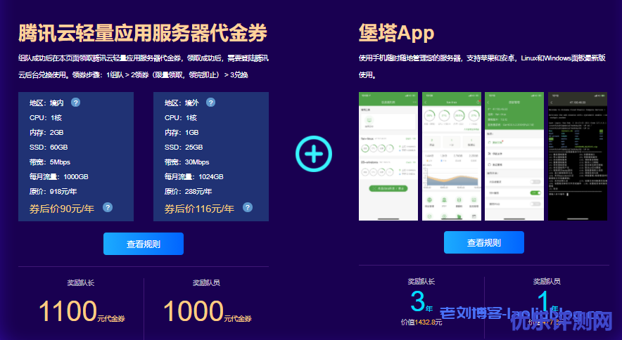 国内比较成熟、用户量较大的宝塔面板(宝塔Linux面板、宝塔Windows面板)目前联合腾讯云开启了免费组队活动。活动参与方式简单,赠送礼品给力!参与方式只需要通过注册宝塔面板账号,在活动页面加入队伍即可领取价值1000元的腾讯云轻量应用服务器代金券及堡塔APP手机插件1年。活动赠送数量有限,仅限5000份。如果当前名额已满,可以搜索关注腾讯云服务器公众号获取后续活动通知,详情介绍如下。