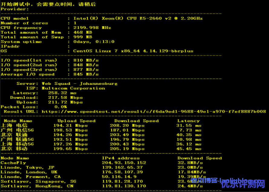 IO测试、宽带测试,硬盘速度达到平均800MB/s,大三运营商多个节点测试上下行带宽高达200Mbps,速度杠杠的,带宽随便跑。