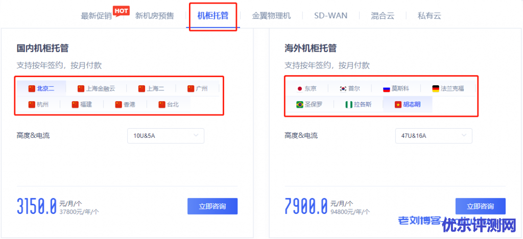 除了云服务器外,UCloud也提供机柜托管相关的服务UCabinet,机柜托管业务的机房多达17个,如北京昌平、上海颛桥、广州、杭州、福建、香港、台北、东京、首尔、莫斯科、法兰克福、圣保罗、拉各斯、胡志明等。目前UCloud北京昌平、上海颛桥两个机房有机柜托管年付促销活动,当然其他机房机柜托管服务如果有需求也可以直接找你的客户经理询价要折扣。