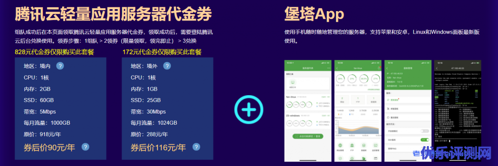 腾讯云轻量应用服务器千元代金券含172元代金券(满288元可用,队长额外可得)和828元代金券(满918元可用,境内机器指定套餐可用)。也就是队长可以获得总计1000元代金券,队员获得828元代金券。活动异常火爆,每天限量组建200队,先到先得。使用堡塔App可以在手机上随时随地管理你的服务器,支持苹果和安卓,Linux和Windows面板最新版使用。组队完成,奖励队长免费使用3年堡塔App,队员免费使用1年堡塔App。