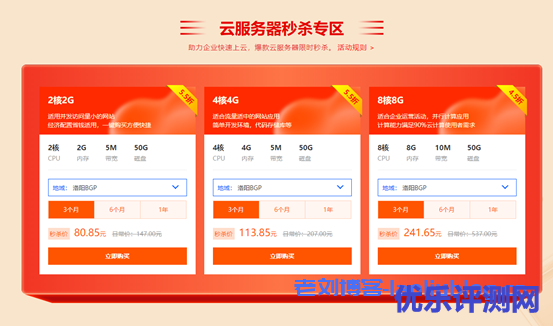 | 4核8G | BGP8M独享 | 80G高效云硬盘 | 河南洛阳BGP线路超低延迟 | 89/月 | 258/季 | 890/年 |