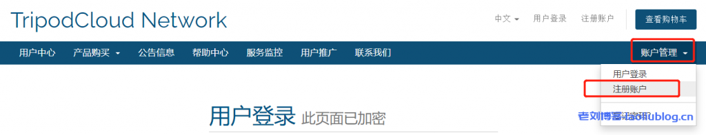 TripodCloud官网注册流程:1,访问官网首页 2,选择客户中心 3,选择账户管理 4,选择注册账户,如下图。