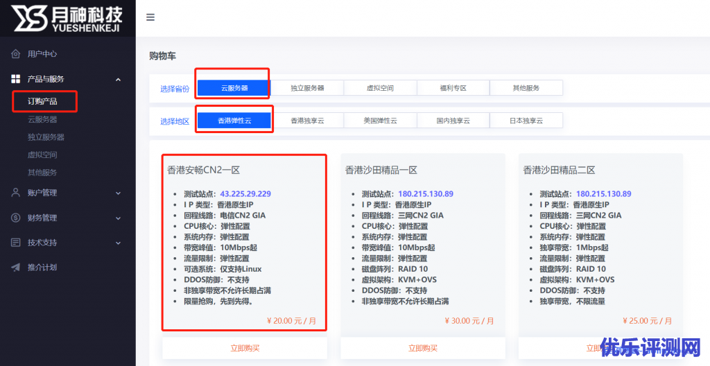 注册登录后,进入用户中心,选择产品与服务中心-订购产品-云服务器-香港弹性云-香港安畅CN2一区,之后选择立即购买即可,购买图示:
