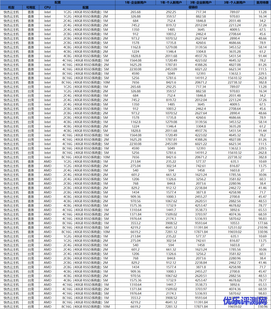 香港台北可用区促销配置及价格