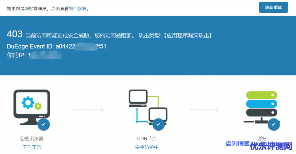 使用百度云加速后站长在网站后台设置出现403怎么办?关于百度云加速报错的问题,老刘博客有在《百度云加速提示:502网关错误,连接源站失败DuEdge Event ID…原因分析及解决办法附如何添加百度云加速节点IP白名单教程》文章中介绍过,不过关于网站遭受CC攻击的情况,只解决了一半问题,本篇文章算是关于百度云加速报错502网关错误解决办法的续章,主要是解决遭受CC攻击后,网站访问报错:403当前访问可能造成安全威胁,您的访问被阻断。 攻击类型:【应用程序漏洞攻击】,DuEdge Event ID:…的情况。