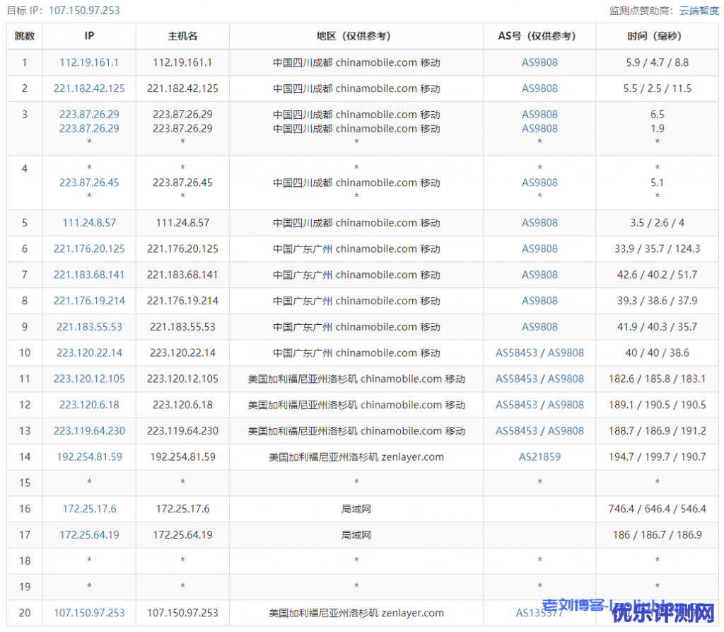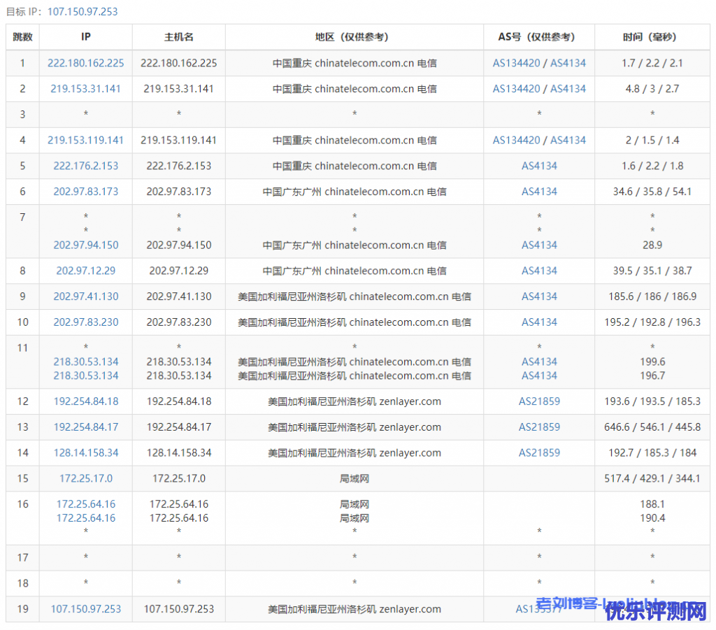 ---------------------------------------------------------------------- 广州电信 traceroute to 14.215.116.1 (14.215.116.1), 30 hops max, 32 byte packets 1 * 2 172.25.65.135 1.14 ms * LAN Address 3 172.25.17.7 6.19 ms * LAN Address 4 104.254.114.22 6.84 ms * United States, California, Los Angeles, zenlayer.com 5 192.254.84.194 1.70 ms AS21859 United States, California, Los Angeles, zenlayer.com 6 192.254.81.3 1.23 ms AS21859 United States, California, Los Angeles, zenlayer.com 7 218.30.53.133 3.02 ms AS4134 United States, California, Los Angeles, ChinaTelecom 8 202.97.92.38 2.17 ms AS4134 China, ChinaTelecom 9 202.97.72.101 155.95 ms * China, ChinaTelecom 10 202.97.12.18 161.21 ms AS4134 China, ChinaTelecom 11 202.97.94.129 173.28 ms AS4134 China, ChinaTelecom 12 113.96.0.105 170.40 ms AS58466 China, Guangdong, Guangzhou, ChinaTelecom 13 183.2.167.249 168.93 ms AS58466 China, Guangdong, Guangzhou, ChinaTelecom 14 183.56.129.10 169.93 ms AS58466 China, Guangdong, Guangzhou, ChinaTelecom 15 14.215.116.1 165.78 ms AS58466 China, Guangdong, Guangzhou, ChinaTelecom ---------------------------------------------------------------------- 上海电信 traceroute to 101.95.120.109 (101.95.120.109), 30 hops max, 32 byte packets 1 * 2 172.25.65.5 1.04 ms * LAN Address 3 172.25.17.1 13.15 ms * LAN Address 4 104.254.114.20 7.94 ms * United States, California, Los Angeles, zenlayer.com 5 192.254.84.192 1.49 ms AS21859 United States, California, Los Angeles, zenlayer.com 6 192.254.84.19 0.79 ms AS21859 United States, California, Los Angeles, zenlayer.com 7 218.30.53.133 6.89 ms AS4134 United States, California, Los Angeles, ChinaTelecom 8 202.97.90.117 1.58 ms AS4134 China, ChinaTelecom 9 202.97.41.237 147.58 ms AS4134 China, ChinaTelecom 10 202.97.33.153 129.66 ms AS4134 China, ChinaTelecom 11 202.97.50.221 138.51 ms AS4134 China, ChinaTelecom 12 101.95.120.109 130.57 ms AS4812 China, Shanghai, ChinaTelecom ---------------------------------------------------------------------- 厦门电信 traceroute to 117.28.254.129 (117.28.254.129), 30 hops max, 32 byte packets 1 * 2 172.25.65.135 1.12 ms * LAN Address 3 172.25.17.1 6.22 ms * LAN Address 4 128.14.158.33 446.51 ms AS21859 United States, California, Los Angeles, zenlayer.com 5 192.254.84.16 1.38 ms AS21859 United States, California, Los Angeles, zenlayer.com 6 192.254.81.27 1.67 ms AS21859 United States, California, Los Angeles, zenlayer.com 7 * 8 * 9 CHINA-TELEC.ear2.LosAngeles1.Level3.net (4.71.136.202) 2.30 ms AS3356,AS3549 United States, California, Los Angeles, level3.com 10 59.43.182.78 162.08 ms * China, ChinaTelecom 11 * 12 59.43.130.161 163.57 ms * China, ChinaTelecom 13 59.43.19.198 171.94 ms * China, ChinaTelecom 14 27.159.81.254 164.05 ms AS133775 China, Fujian, Xiamen, ChinaTelecom 15 27.159.81.210 165.91 ms AS133775 China, Fujian, Xiamen, ChinaTelecom 16 117.25.141.110 174.42 ms AS133775 China, Fujian, Xiamen, ChinaTelecom 17 117.28.254.129 178.44 ms AS4809 China, Fujian, Xiamen, ChinaTelecom ---------------------------------------------------------------------- 重庆联通 traceroute to 113.207.25.138 (113.207.25.138), 30 hops max, 32 byte packets 1 * 2 172.25.65.135 0.39 ms * LAN Address 3 172.25.17.1 6.33 ms * LAN Address 4 128.14.158.33 986.00 ms AS21859 United States, California, Los Angeles, zenlayer.com 5 192.254.84.16 1.01 ms AS21859 United States, California, Los Angeles, zenlayer.com 6 192.254.81.27 1.58 ms AS21859 United States, California, Los Angeles, zenlayer.com 7 219.158.45.181 5.89 ms AS4837 China, ChinaUnicom 8 219.158.97.205 162.84 ms AS4837 China, ChinaUnicom 9 219.158.103.25 163.81 ms AS4837 China, ChinaUnicom 10 219.158.8.117 162.96 ms AS4837 China, ChinaUnicom 11 219.158.99.210 201.18 ms AS4837 China, ChinaUnicom 12 113.207.25.138 186.95 ms AS4837 China, Chongqing, ChinaUnicom ---------------------------------------------------------------------- 成都联通 traceroute to 119.6.6.6 (119.6.6.6), 30 hops max, 32 byte packets 1 * 2 172.25.65.135 0.43 ms * LAN Address 3 172.25.17.7 7.45 ms * LAN Address 4 104.254.114.22 5.57 ms * United States, California, Los Angeles, zenlayer.com 5 192.254.84.194 5.18 ms AS21859 United States, California, Los Angeles, zenlayer.com 6 192.254.81.31 1.11 ms AS21859 United States, California, Los Angeles, zenlayer.com 7 219.158.45.181 3.21 ms AS4837 China, ChinaUnicom 8 219.158.96.233 158.31 ms AS4837 China, ChinaUnicom 9 219.158.97.30 161.72 ms AS4837 China, ChinaUnicom 10 219.158.97.1 165.13 ms AS4837 China, ChinaUnicom 11 219.158.97.74 187.90 ms AS4837 China, ChinaUnicom 12 119.6.197.202 189.63 ms AS4837 China, Sichuan, Chengdu, ChinaUnicom 13 119.7.220.226 184.29 ms AS4837 China, Sichuan, Chengdu, ChinaUnicom 14 119.6.6.6 191.30 ms AS4837 China, Sichuan, Chengdu, ChinaUnicom ---------------------------------------------------------------------- 上海移动 traceroute to 120.204.197.126 (120.204.197.126), 30 hops max, 32 byte packets 1 * 2 172.25.65.135 0.44 ms * LAN Address 3 172.25.17.1 5.86 ms * LAN Address 4 128.14.158.33 868.18 ms AS21859 United States, California, Los Angeles, zenlayer.com 5 192.254.84.16 1.00 ms AS21859 United States, California, Los Angeles, zenlayer.com 6 192.254.81.49 1.22 ms AS21859 United States, California, Los Angeles, zenlayer.com 7 223.119.64.229 0.81 ms AS58453 China, Hong Kong, ChinaMobile 8 223.120.6.17 0.96 ms AS58453 China, ChinaMobile 9 223.120.13.46 181.99 ms AS58453 China, ChinaMobile 10 221.183.55.26 183.59 ms AS9808 China, ChinaMobile 11 221.176.22.205 182.37 ms AS9808 China, ChinaMobile 12 221.176.22.33 184.70 ms AS9808 China, ChinaMobile 13 * 14 117.143.13.66 186.49 ms AS24400 China, Shanghai, ChinaMobile 15 120.204.194.14 187.00 ms AS24400 China, Shanghai, ChinaMobile 16 120.204.197.126 183.35 ms AS24400 China, Shanghai, ChinaMobile ---------------------------------------------------------------------- 成都移动 traceroute to 183.221.253.100 (183.221.253.100), 30 hops max, 32 byte packets 1 * 2 172.25.65.5 0.78 ms * LAN Address 3 1
