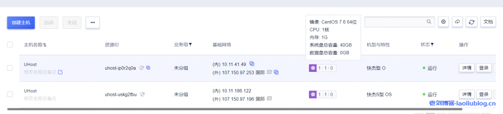 镜像是CentOS 7.6 64位,1核心,1G内存,40G系统盘,无数据盘(UCloud支持免费送40G以内的系统盘),外网IP是107.150.97.253。