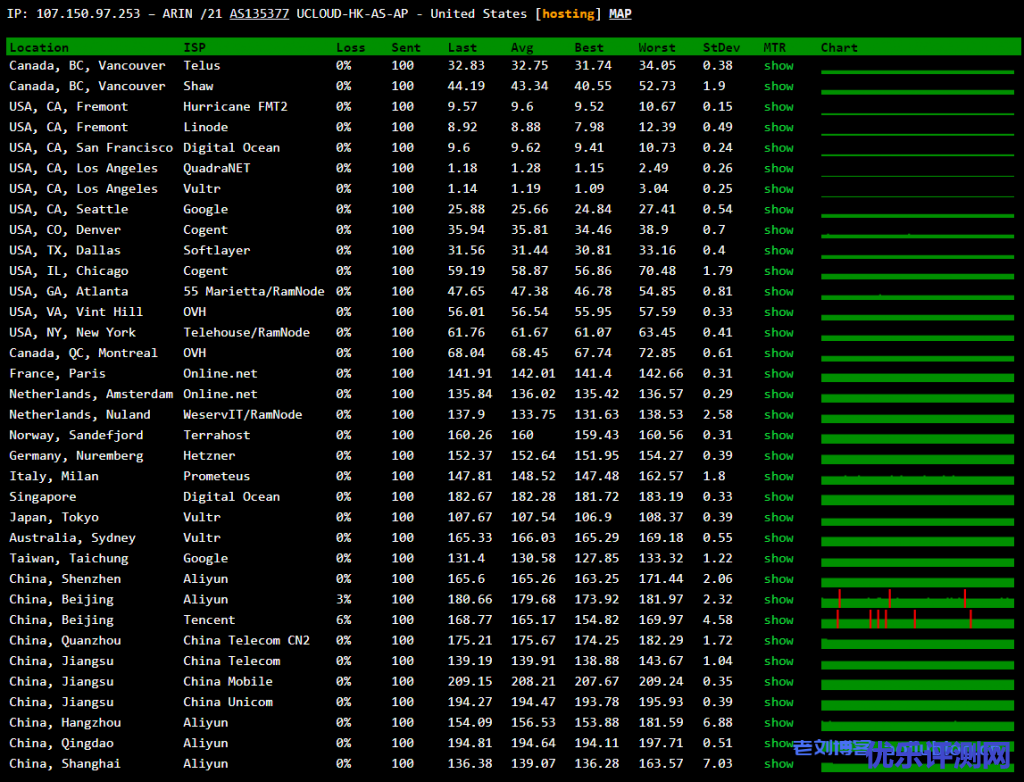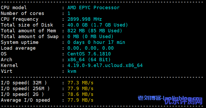 老刘博客昨天听说UCloud上线了洛杉矶可用区快杰型云服务器,于是就跑去测评了下。注意到洛杉矶快杰云主机分为intel快杰S型OS云服务器和AMD快杰型O云服务器,这里是UCloud洛杉矶intel快杰S型OS云服务器最低配置(1核1G内存1M带宽40G系统盘)测评结果,供网友们参考。(昨天测评,今天整理)