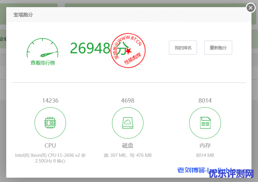 宝塔跑分26948,性能彪悍,机器配置信息与脚本测试结果一致。