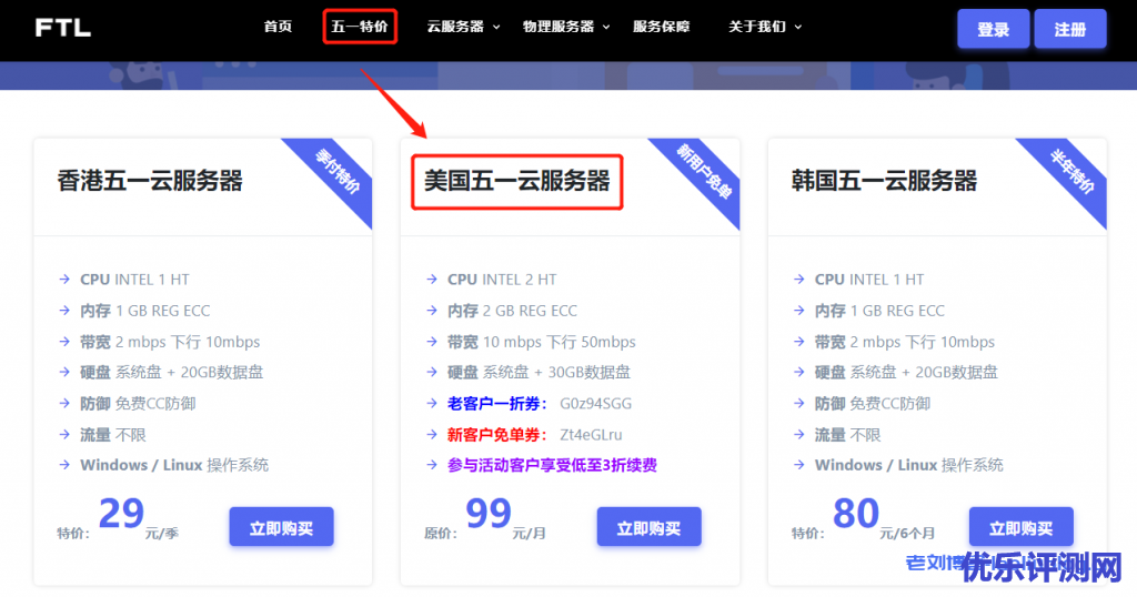 如何参与本次FTL超云五一活动?首先通过以上免单或五一活动入口进入商家官网首页,选择导航栏”五一特价“,继而选择美国五一云服务器,图示: