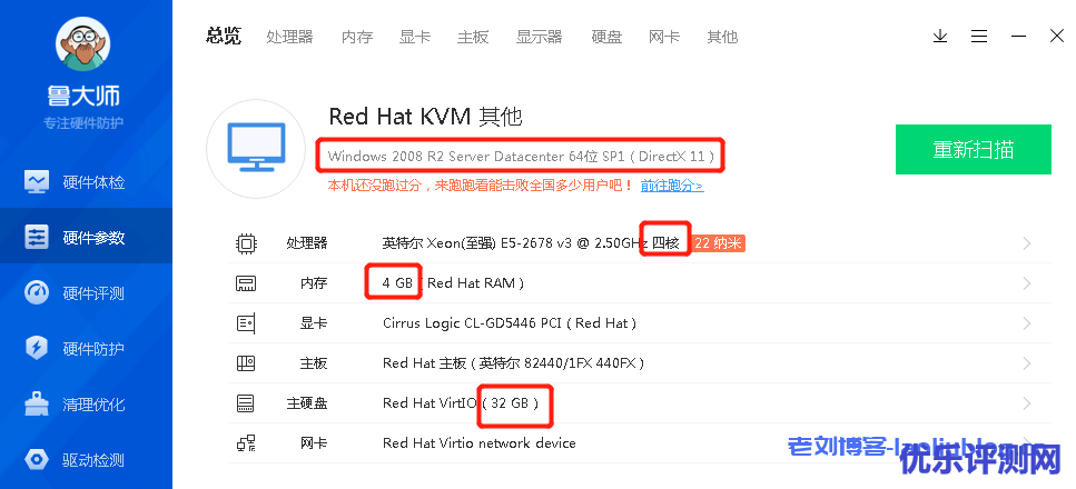 亿云互联云挂机宝鲁大师硬件参数数据,4核4G内存,32GB硬盘(>官方说法30GB)