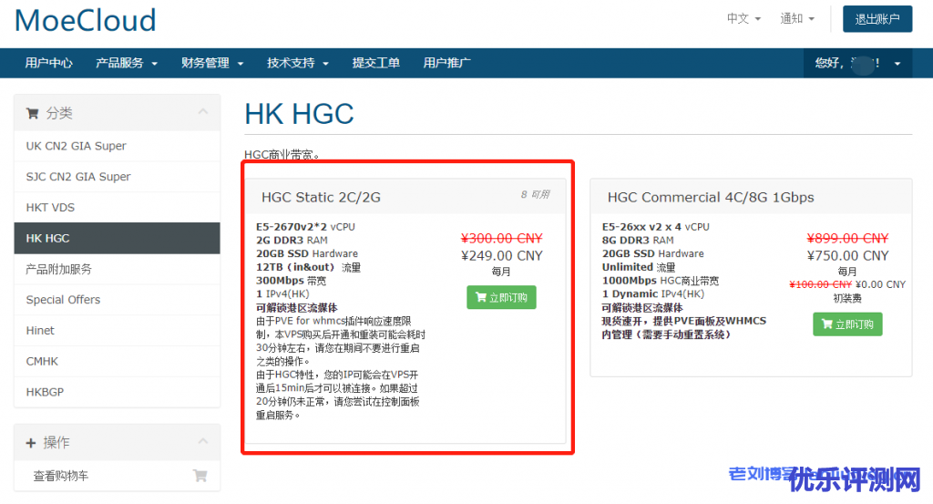 MoeCloud萌云香港HGC商业带宽原生IP补货套餐配置信息: