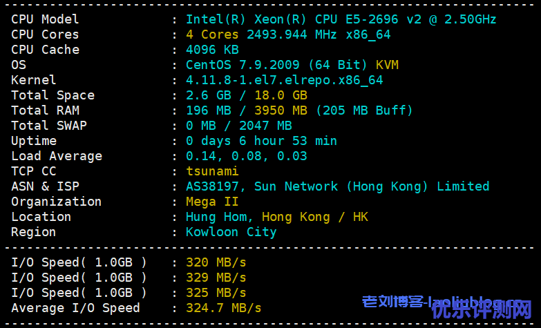 快云科技香港云新界CN2线路7区测试机配置及IO性能测试,4核4G内存,CPU是Intel(R) Xeon(R) CPU E5-2696 v2 @ 2.50GHz,与控制台描述一致。IO平均速度在324.7MB/s,表现还不错。