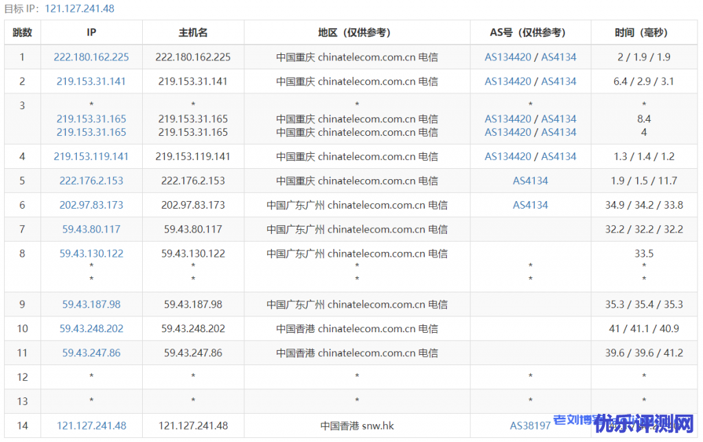 重庆电信去程,走电信AS4134线路,在广州和香港节点走了59.43,即去程电信CN2
