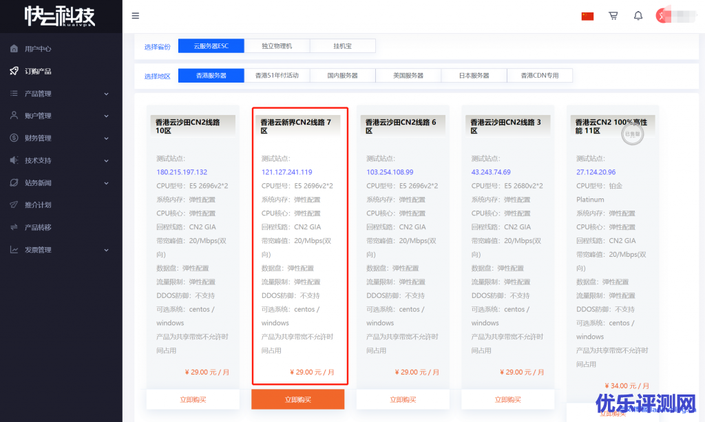 快云科技香港云新界CN2线路7区控制台信息,该配置价格29元/月起: