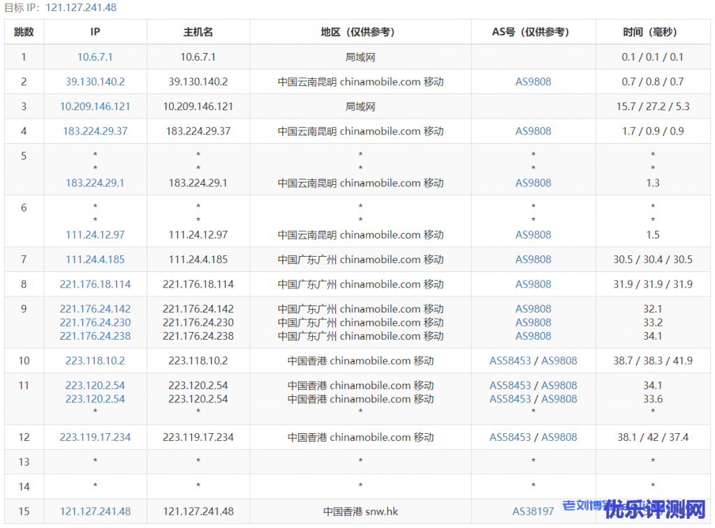 昆明移动去程,走移动AS9808线路,即移动CMI,移动去程直连