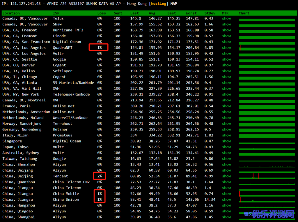 快云科技香港云新界CN2线路7区丢包率测试,4处节点出现丢包,均在2%以内。
