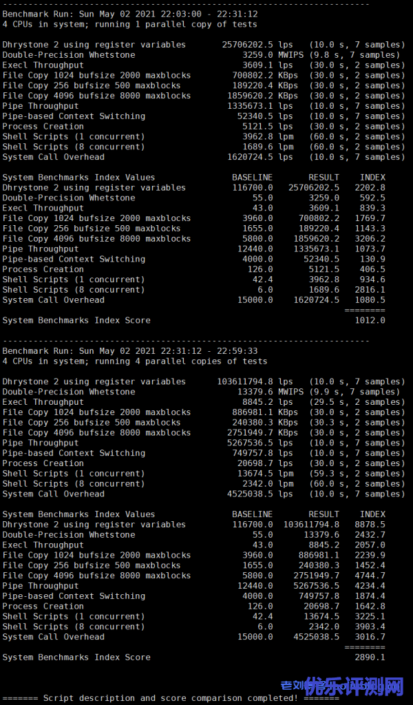 用UnixBench脚本跑分值是2890.1(4程跑分)。得分小于400的性能比较差、500-1000正常、大于1000优秀、大于2000极好。当然跑分不是认定机器好坏的唯一标准,需要综合考虑。这里跑分值2890.1属于极好级别。