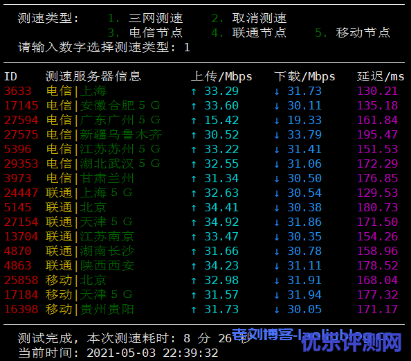 SuperSpeed脚本测试了酷锐云主机美国CERA GIA 2区D型主机国内节点三网上传/下载速度,可以看出均能跑满30Mbps。延迟也均在200ms以内。