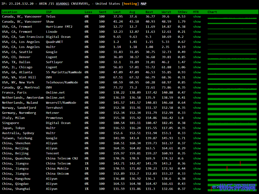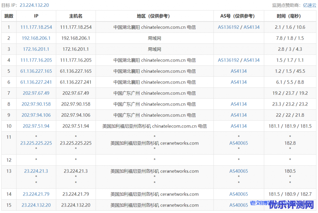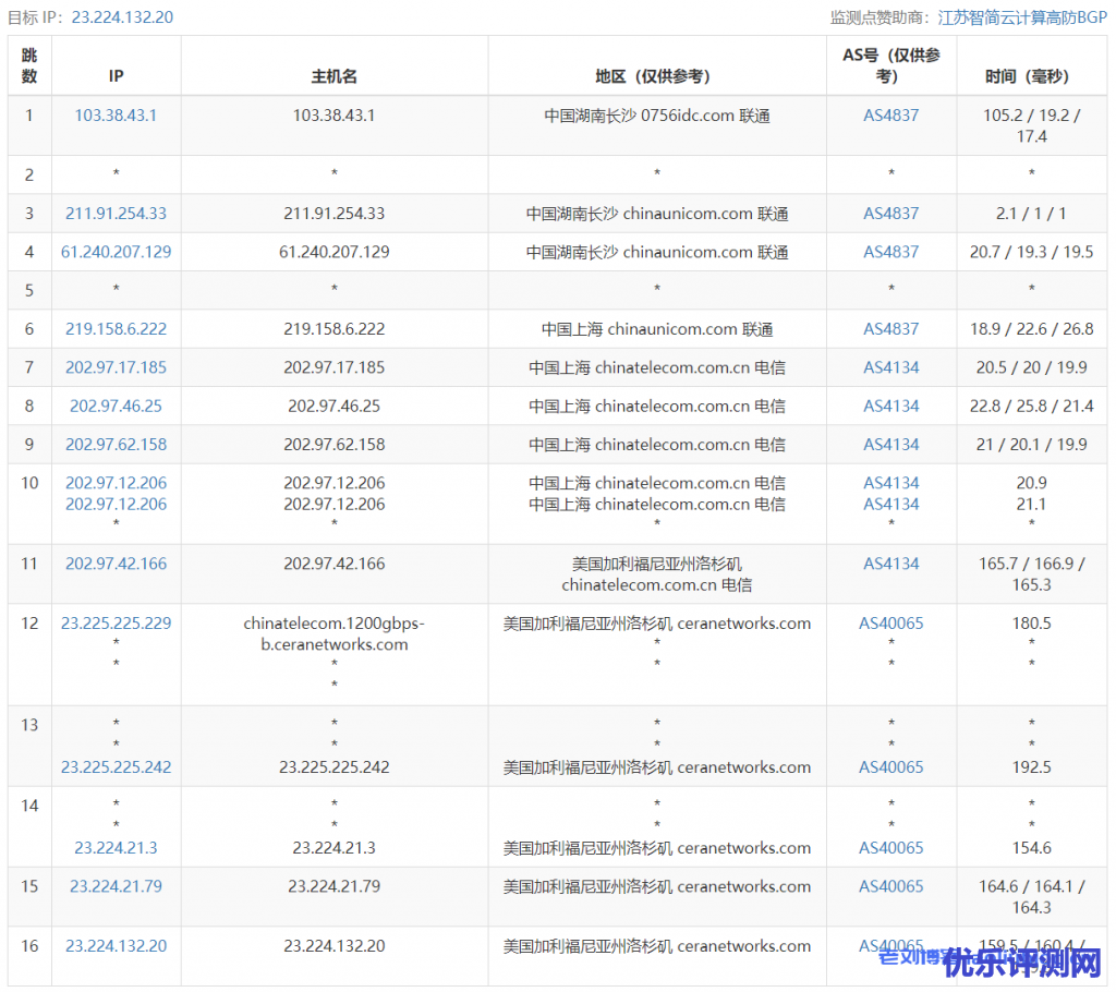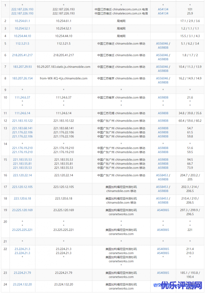 ---------------------------------------------------------------------- 广州电信 traceroute to 14.215.116.1 (14.215.116.1), 30 hops max, 32 byte packets 1 23.224.132.1 1.86 ms AS40065 美国, 加利福尼亚州, 洛杉矶, ceranetworks.com 2 23.224.21.78 0.68 ms AS40065 美国, 加利福尼亚州, 洛杉矶, ceranetworks.com 3 192.168.207.18 0.85 ms * 局域网 4 192.168.207.1 0.76 ms * 局域网 5 cn2-gia.ceranetworks.com (23.225.225.245) 1.27 ms AS40065 美国, 加利福尼亚州, 洛杉矶, ceranetworks.com 6 59.43.182.74 151.23 ms * 中国, 广东, 广州, chinatelecom.com.cn, 电信 7 * 8 59.43.130.145 153.02 ms * 中国, 广东, 广州, chinatelecom.com.cn, 电信 9 59.43.80.122 155.00 ms * 中国, 广东, 广州, chinatelecom.com.cn, 电信 10 113.108.208.190 154.87 ms AS58466 中国, 广东, 广州, chinatelecom.com.cn, 电信 11 113.96.4.226 162.59 ms AS58466 中国, 广东, 广州, chinatelecom.com.cn, 电信 12 183.2.167.245 154.01 ms AS58466 中国, 广东, 广州, chinatelecom.com.cn, 电信 13 183.56.129.10 152.97 ms AS58466 中国, 广东, 广州, chinatelecom.com.cn, 电信 14 14.215.116.1 154.46 ms AS58466 中国, 广东, 广州, chinatelecom.com.cn, 电信 ---------------------------------------------------------------------- 上海电信 traceroute to 101.95.120.109 (101.95.120.109), 30 hops max, 32 byte packets 1 23.224.132.1 1.97 ms AS40065 美国, 加利福尼亚州, 洛杉矶, ceranetworks.com 2 23.224.21.78 0.81 ms AS40065 美国, 加利福尼亚州, 洛杉矶, ceranetworks.com 3 192.168.207.18 0.91 ms * 局域网 4 192.168.207.1 0.80 ms * 局域网 5 cn2-gia.ceranetworks.com (23.225.225.245) 1.00 ms AS40065 美国, 加利福尼亚州, 洛杉矶, ceranetworks.com 6 59.43.182.89 128.07 ms * 美国, 加利福尼亚州, 洛杉矶, chinatelecom.com.cn, 电信 7 59.43.187.61 129.18 ms * 中国, 上海, chinatelecom.com.cn, 电信 8 59.43.138.45 129.66 ms * 中国, 上海, chinatelecom.com.cn, 电信 9 101.95.120.109 132.19 ms AS4812 中国, 上海, chinatelecom.com.cn, 电信 ---------------------------------------------------------------------- 厦门电信 traceroute to 117.28.254.129 (117.28.254.129), 30 hops max, 32 byte packets 1 23.224.132.1 1.82 ms AS40065 美国, 加利福尼亚州, 洛杉矶, ceranetworks.com 2 * 3 192.168.207.18 0.83 ms * 局域网 4 * 5 cn2-gia.ceranetworks.com (23.225.225.245) 1.26 ms AS40065 美国, 加利福尼亚州, 洛杉矶, ceranetworks.com 6 59.43.182.78 154.94 ms * 中国, 广东, 广州, chinatelecom.com.cn, 电信 7 * 8 59.43.130.101 156.65 ms * 中国, 广东, 广州, chinatelecom.com.cn, 电信 9 59.43.98.206 171.12 ms * 中国, 福建, 厦门, chinatelecom.com.cn, 电信 10 * 11 27.159.81.190 181.35 ms AS133775 中国, 福建, 厦门, chinatelecom.com.cn, 电信 12 117.25.141.106 160.25 ms AS133775 中国, 福建, 厦门, chinatelecom.com.cn, 电信 13 117.28.254.129 176.13 ms AS4809 中国, 福建, 厦门, chinatelecom.com.cn, 电信 ---------------------------------------------------------------------- 重庆联通 traceroute to 113.207.25.138 (113.207.25.138), 30 hops max, 32 byte packets 1 23.224.132.1 1.85 ms AS40065 美国, 加利福尼亚州, 洛杉矶, ceranetworks.com 2 23.224.21.78 0.65 ms AS40065 美国, 加利福尼亚州, 洛杉矶, ceranetworks.com 3 192.168.207.18 0.93 ms * 局域网 4 * 5 cn2-gia.ceranetworks.com (23.225.225.245) 1.21 ms AS40065 美国, 加利福尼亚州, 洛杉矶, ceranetworks.com 6 59.43.182.78 170.16 ms * 中国, 广东, 广州, chinatelecom.com.cn, 电信 7 * 8 59.43.130.149 156.32 ms * 中国, 广东, 广州, chinatelecom.com.cn, 电信 9 219.158.38.245 159.89 ms AS4837 中国, 北京, chinaunicom.com, 联通 10 219.158.10.249 164.00 ms AS4837 中国, 广东, 广州, chinaunicom.com, 联通 11 219.158.99.210 189.12 ms AS4837 中国, 浙江, 杭州, chinaunicom.com, 联通 12 113.207.25.138 184.35 ms AS4837 中国, 重庆, chinaunicom.com, 联通 ---------------------------------------------------------------------- 成都联通 traceroute to 119.6.6.6 (119.6.6.6), 30 hops max, 32 byte packets 1 23.224.132.1 1.70 ms AS40065 美国, 加利福尼亚州, 洛杉矶, ceranetworks.com 2 * 3 192.168.207.18 0.57 ms * 局域网 4 192.168.207.1 0.82 ms * 局域网 5 cn2-gia.ceranetworks.com (23.225.225.245) 1.24 ms AS40065 美国, 加利福尼亚州, 洛杉矶, ceranetworks.com 6 59.43.246.233 155.12 ms * 中国, 广东, 广州, chinatelecom.com.cn, 电信 7 * 8 59.43.130.125 153.88 ms * 中国, 广东, 广州, chinatelecom.com.cn, 电信 9 219.158.40.169 163.62 ms AS4837 中国, 广东, 广州, chinaunicom.com, 联通 10 * 11 219.158.97.74 186.93 ms AS4837 中国, 四川, 成都, chinaunicom.com, 联通 12 119.6.197.254 196.69 ms AS4837 中国, 四川, 成都, chinaunicom.com, 联通 13 119.7.220.226 191.13 ms AS4837 中国, 四川, 成都, chinaunicom.com, 联通 14 119.6.6.6 189.58 ms AS4837 中国, 四川, 成都, chinaunicom.com, 联通 ---------------------------------------------------------------------- 上海移动 traceroute to 120.204.197.126 (120.204.197.126), 30 hops max, 32 byte packets 1 23.224.132.1 2.05 ms AS40065 美国, 加利福尼亚州, 洛杉矶, ceranetworks.com 2 23.224.21.78 0.73 ms AS40065 美国, 加利福尼亚州, 洛杉矶, ceranetworks.com 3 192.168.207.18 0.87 ms * 局域网 4 192.168.207.1 0.94 ms * 局域网 5 cn2-gia.ceranetworks.com (23.225.225.245) 1.10 ms AS40065 美国, 加利福尼亚州, 洛杉矶, ceranetworks.com 6 59.43.189.33 127.38 ms * 中国, 上海, chinatelecom.com.cn, 电信 7 59.43.246.213 148.49 ms * 中国, 上海, chinatelecom.com.cn, 电信 8 59.43.138.49 134.96 ms * 中国, 上海, chinatelecom.com.cn, 电信 9 59.43.80.141 141.28 ms * 中国, 上海, chinatelecom.com.cn, 电信 10 202.97.87.130 133.51 ms AS4134 中国, 上海, chinatelecom.com.cn, 电信 11 * 12 221.183.90.237 157.50 ms AS9808 中国, chinamobile.com, 移动 13 221.183.60.50 155.61 ms AS9808 中国, 上海, chinamobile.com, 移动 14 120.204.194.14 161.05 ms AS9808,AS244