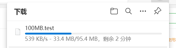 100MB测速文件下载到本地用时63s,平均下载速度是1.51MB/s,恰好与上传速度相等。