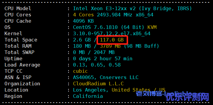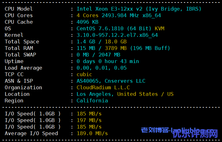 测试结果:4核4G内存,操作系统CentOS 7.6,机器位置在美国加利福尼亚州洛杉矶,符合官方描述。同时我们注意到Total RAM只有18GB,这部分只是系统盘18GB,考虑到swap占用以及计算进位不同(有些按1000进位,有些按1024进位),官方报20GB系统盘,没有毛病。酷锐云主机美国CERA GIA 2区D型主机IO平均速度为189MB/s,还行。