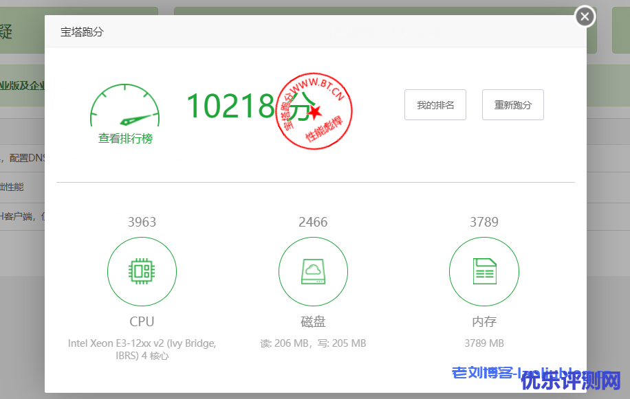 宝塔跑分值10218,性能彪悍,磁盘读写均在205MB/s,与前文测试的189MB/s,接近。