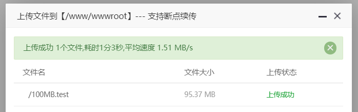 100MB测速文件上传到服务器,平均速度1.51MB/s。