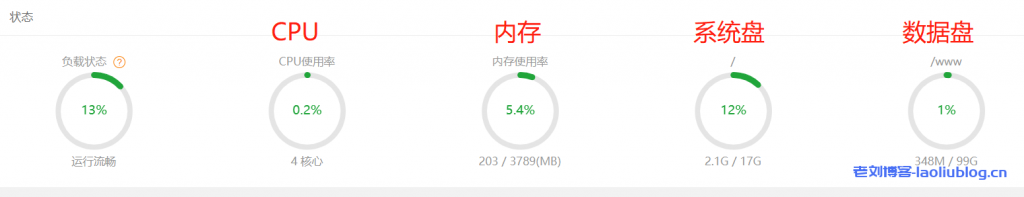 同时宝塔面板上,我们可以清楚地看到配置信息,如系统盘17G,数据盘99G,这边脚本跑出来的数据更直观,可视化强。