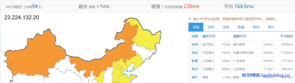 借助站点ping.chinaz.com对主机进行了ping测试,平均延时164.6ms,还可以。