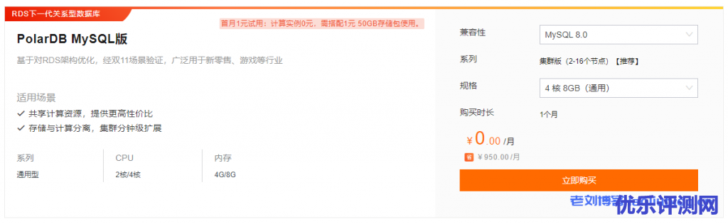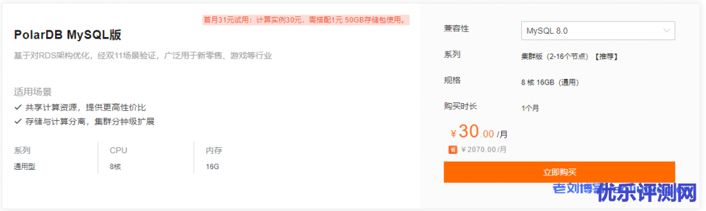 首购优惠PolarDB 4核16G或8核16G计算实例+50GB存储包首月31元,限首次首件!